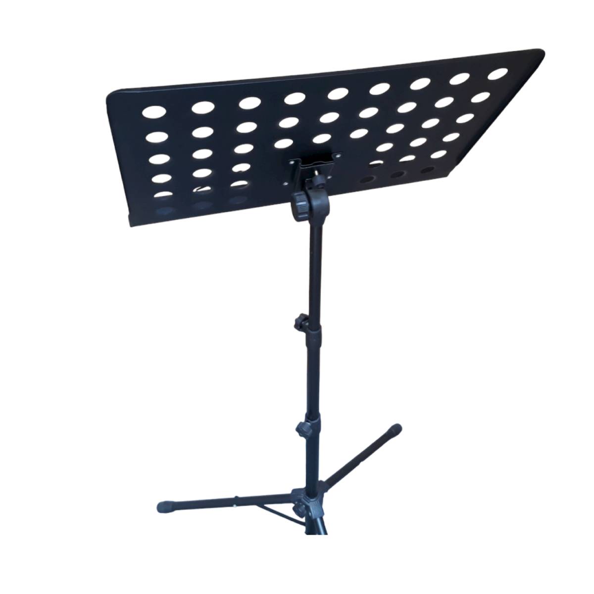 Atril de partitura tipo director Fabricado en metal resistente Dimensiones base: 49cm x 35cm Altura ajustable (dimensiones con patas estiradas max): 75cm – 147cm Peso: 1,9Kg